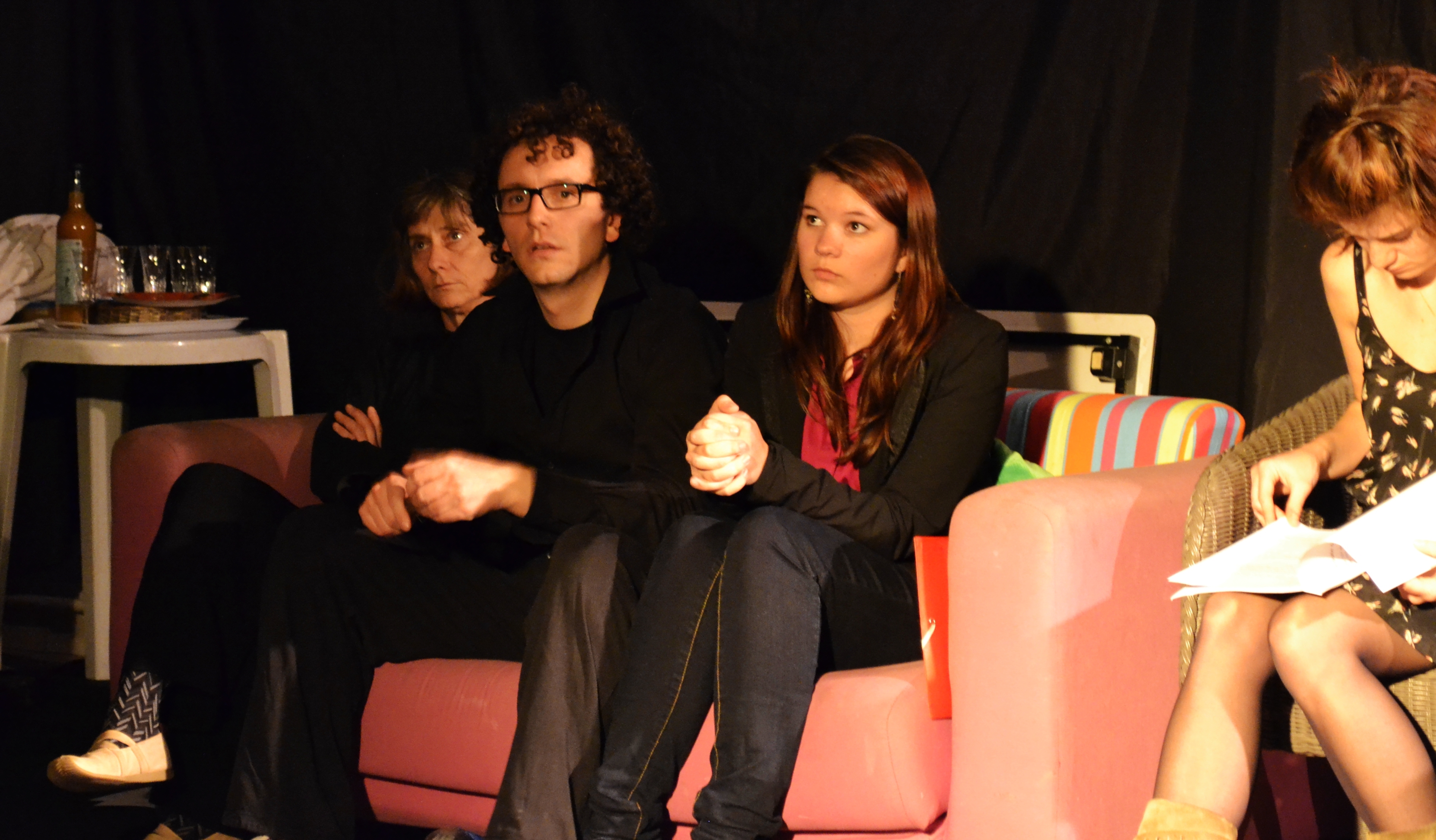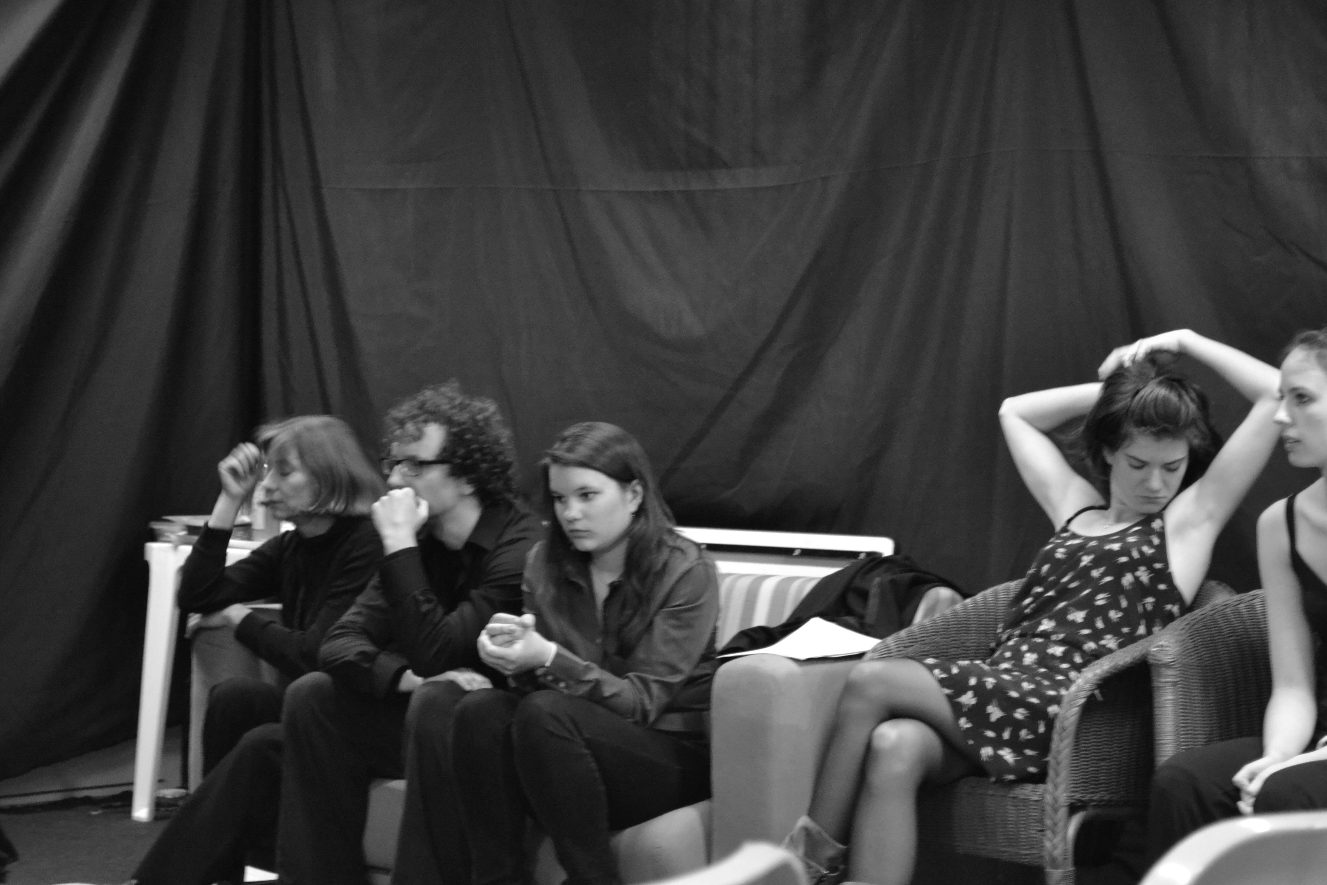 Tour à tour concentrés, lascifs, rêveurs, tracassés pendant le filage, les Embarqués nous offrent une vision de ce qui se passe normalement en coulisses, à l’abri des regards.Maud est intensément intéressée!Sourire en regardant les collègues jouer.