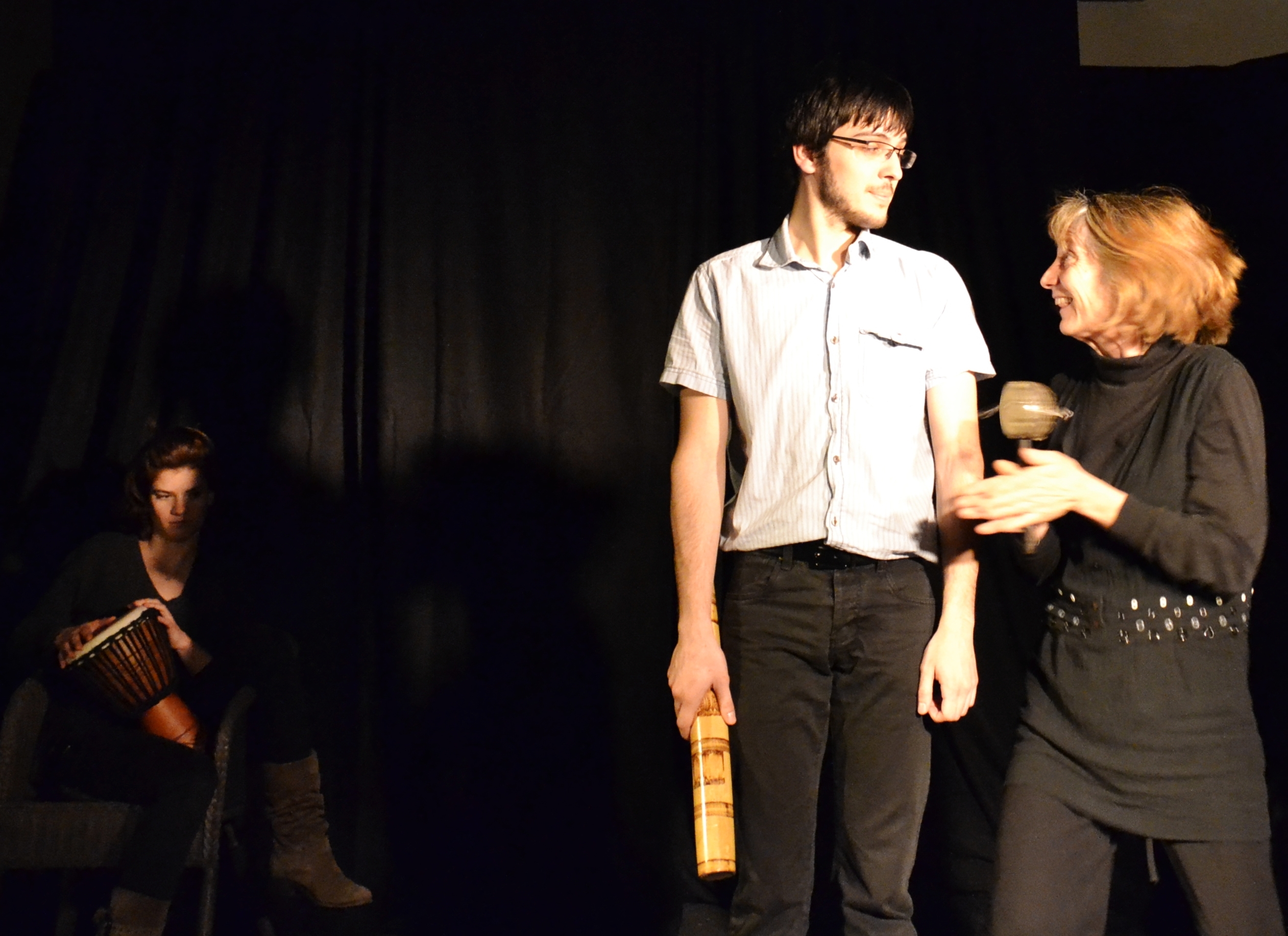 Hélène nous présente un personnage touchant, plein d’espoir mais aussi de désillusion alors que l’image de l’homme face à elle se fait plus nette… pas d’amertume mais beaucoup d’ironie dans cette scène.Au fil des percussions, deux personnages (interprétés par Sylvie et Benjamin) se croisent. L’un se tient en retrait, l’autre va à la rencontre et cherche à instaurer un contact. Un tableau doux-amer.